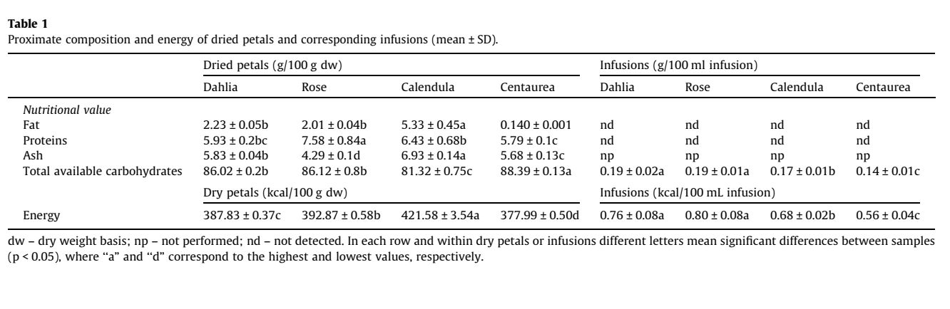 In particular, the nutritional and chemical composition of rose (Rosa canina L.) and calendula flowers have already been studied (Barros, Carvalho, & Ferreira, 2011; Miguel et al., 2016), also the fatty acids composition of calendula seeds oils (Dulf, Pamfil, Baciu, & Pintea, 2013) and the crude protein of centaurea (Centaurea cyanus L.) flowers (Rop et al., 2012). Despite the existence of some publications regarding edible flowers, it is important to compare their potential to be used in different forms, namely as fresh produces or in infusion preparations. Therefore, in the present work, edible petals of different species (dahlia, rose, calendula and centaurea) were characterized in terms of macronutrients composition, energetic value, fatty acids, soluble sugars, organic acids and tocopherols, and compared to the nutritional composition of their infusions.