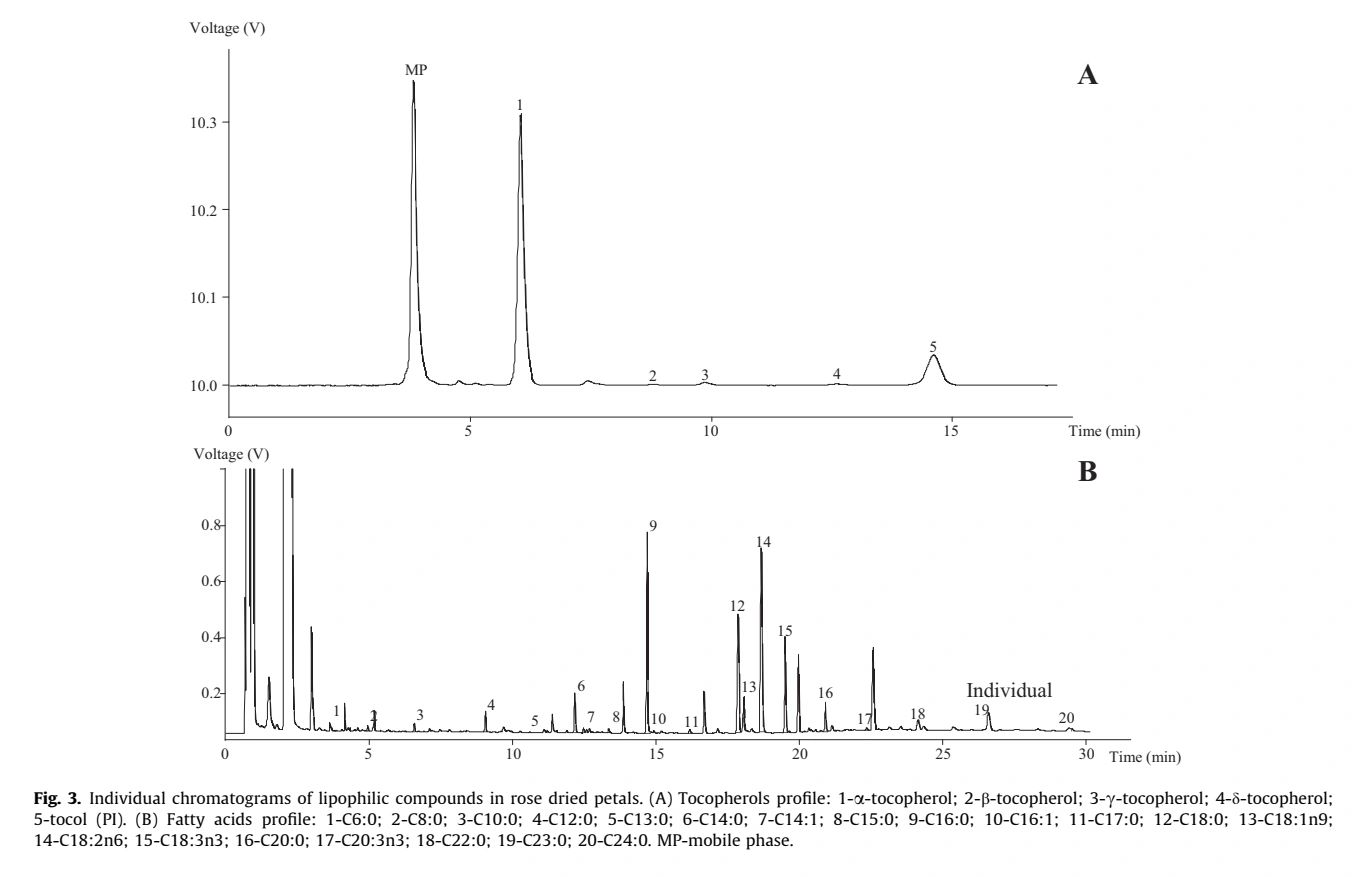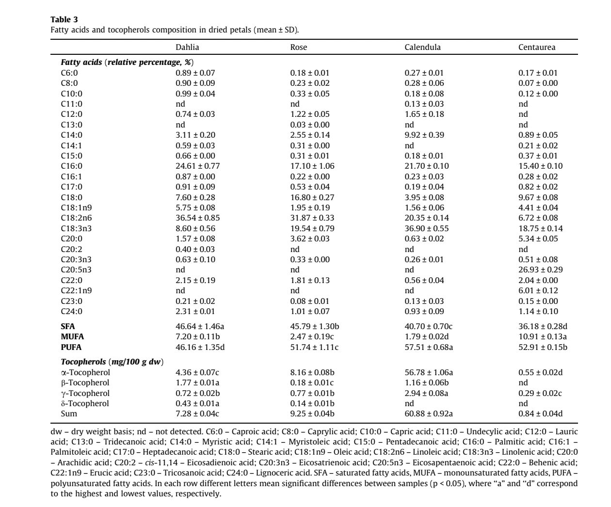 The four isoforms of tocopherols were determined in dried powdered petals, according to the previously described procedure