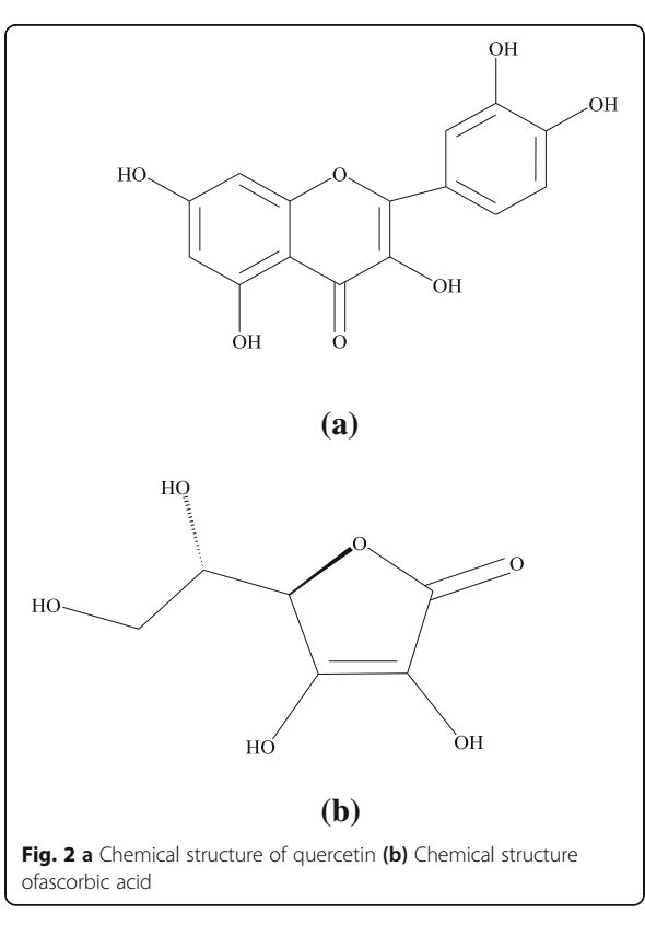 The guava fruit contains vitamin A, C, iron, phosphorus and calcium. It has more vitamin C than the orange. The fruit contains saponin, oleanolic acid, lyxopyranoside, arabopyranoside, guaijavarin, quercetin and flavonoids [5, 7, 15]. Ascorbic acid and citric acid are the major ingredients of guava that play important role in anti-mutagenic activity [16]. The chemical structures of quercetin and ascorbic acid have been shown in Fig. 2. The skin of fruit contains ascorbic acid in very high amount; however, it may be destroyed by heat. The strong pleasant smell of fruit is credited to the carbonyl compounds [15]. Guava fruit contains terpenes, caryophyllene oxide and p-selinene in large quantity which produce relaxation effects [17]. The flavonoid content is higher in the methanolic extract of the guava [18]. There are 41 hydrocarbons 25 esters, 13 alcohols and 9 aromatic compounds in guava [19]. Titratable acidity and the total soluble solids are present in fruit [20]. Guajadial is also present in guava [21]. Essential oil is present in leaves which contain α-pinene, limonene, β-pinene, isopropyl alcohol, menthol, terpenyl acetate, caryophyllene, longicyclene and β-bisabolene. Oleanolic acid is also found in the guava leaves [22]. Leaves have high content of limonene about 42.1% and caryophyllene about 21.3% [23]. Leaves of guava have a lot of volatile compounds [24, 25]. The bark includes 12–30% of tannin and one source declares that it includes tannin 27.4%, or polyphenols, resin and the crystals of calcium oxalate. Tannin is also present in roots. Leukocyanidins, gallic acid and sterols are also present in roots. Carbohydrates with salts are present in abundance. Tannic acid is also its part.